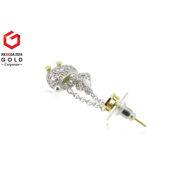 These silver earrings are like a Rabbit Lantern, the famous lantern of the Mid-Autumn festival in Hong Kong. The Rabbit Lantern’s body is made with our brand’s special texture. We set the red Swarovski stones in the eyes and also set a nature fluorite inside the body. When you put the earrings in a dark area, they will fluoresce like a real lantern.